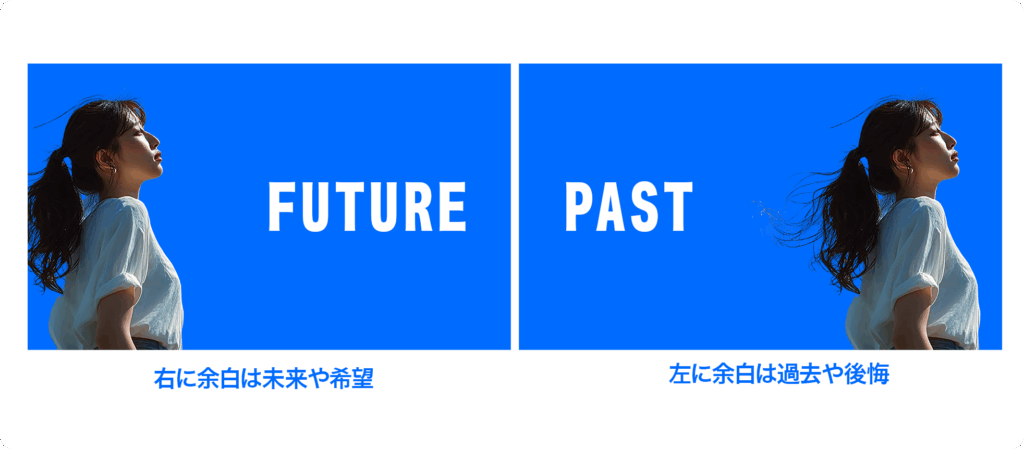 逆に、左側に余白があると「後ろ姿=過去」を連想しやすくなり、「振り返る」「後悔」「思い出」といった感情が生まれます。