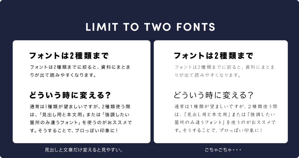 フォントは2種類までに絞ると、資料にまとまりが出て読みやすくなります。通常は1種類が望ましいですが、2種類使う際は、「見出し用と本文用」または「強調したい箇所のみ違うフォント」を使うのがおススメです。そうすることで、プロっぽい印象に!